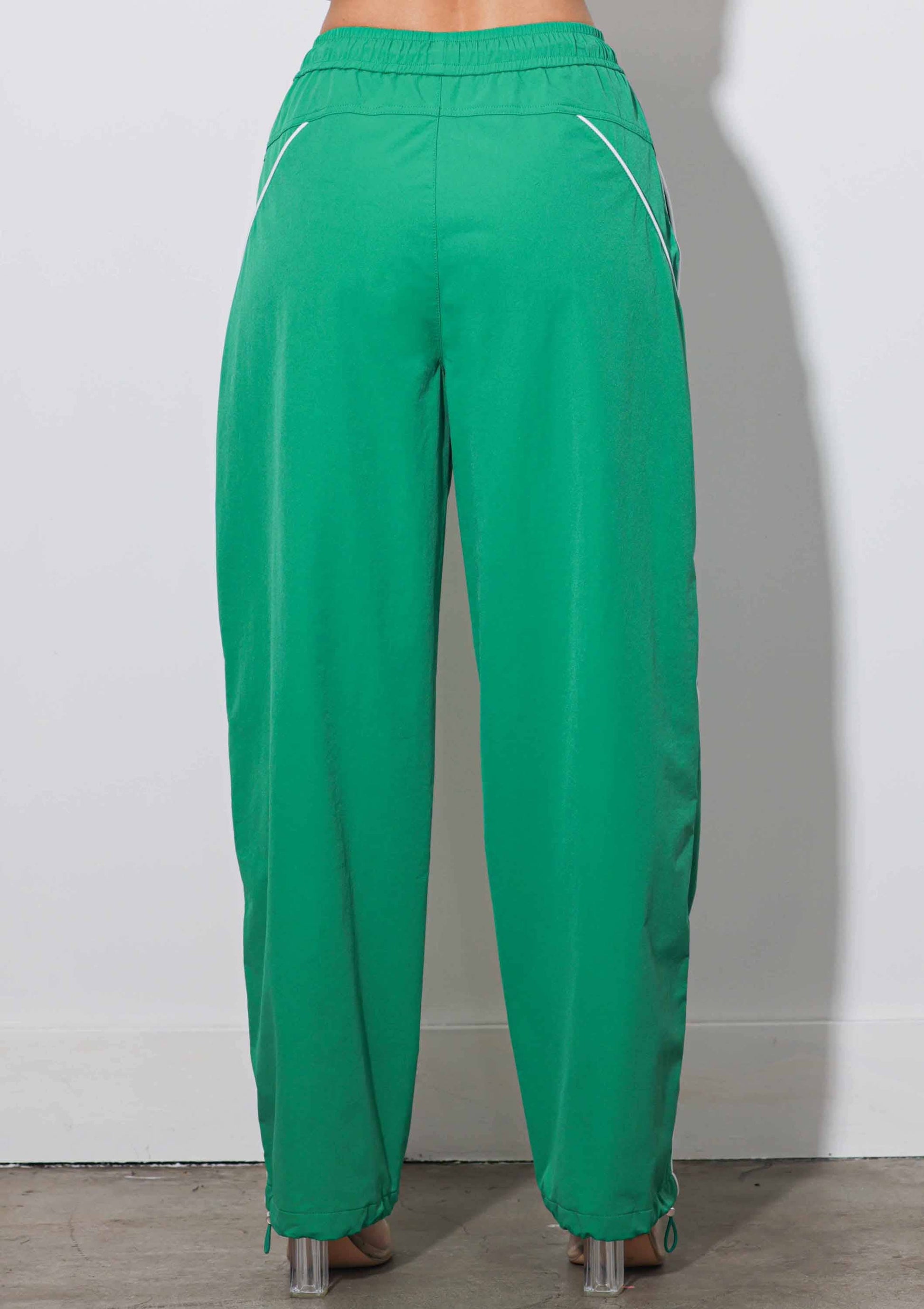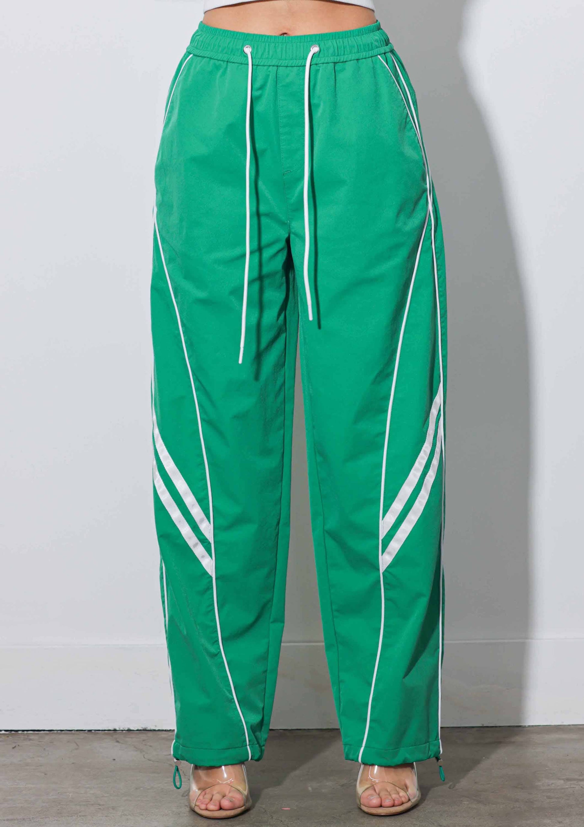 A pair of baggy track pants featuring elastic waist with drawstring, adjustable leg opening with drawstring.