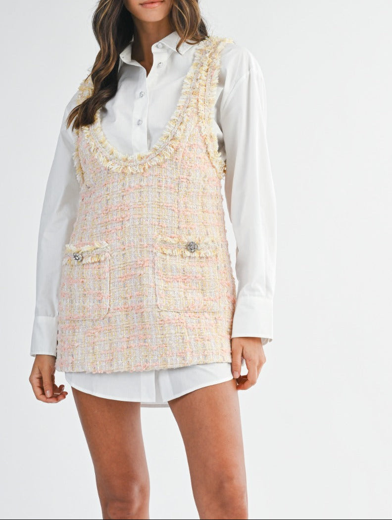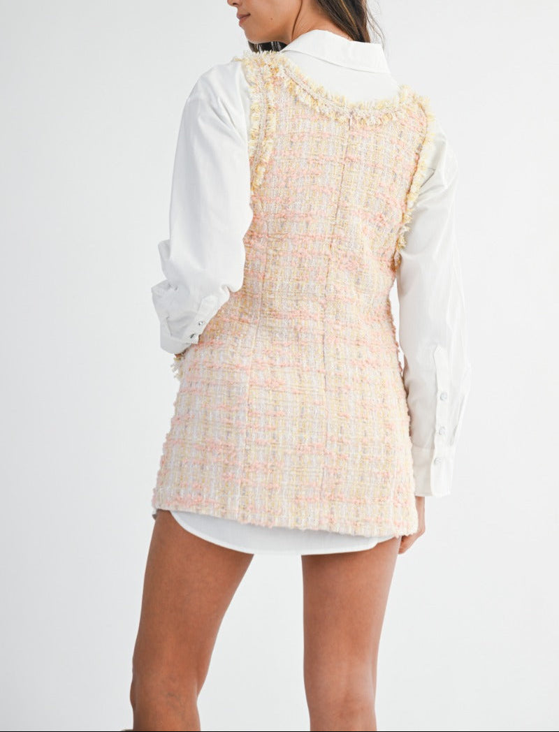 Textured tweed sleeveless deep scoop neck front pocket mini dress with fringe trim detail and contrast long sleeve button down shirt set. Dress has back invisible zipper. Lining. (Long sleeve white button down dress shirt included.)