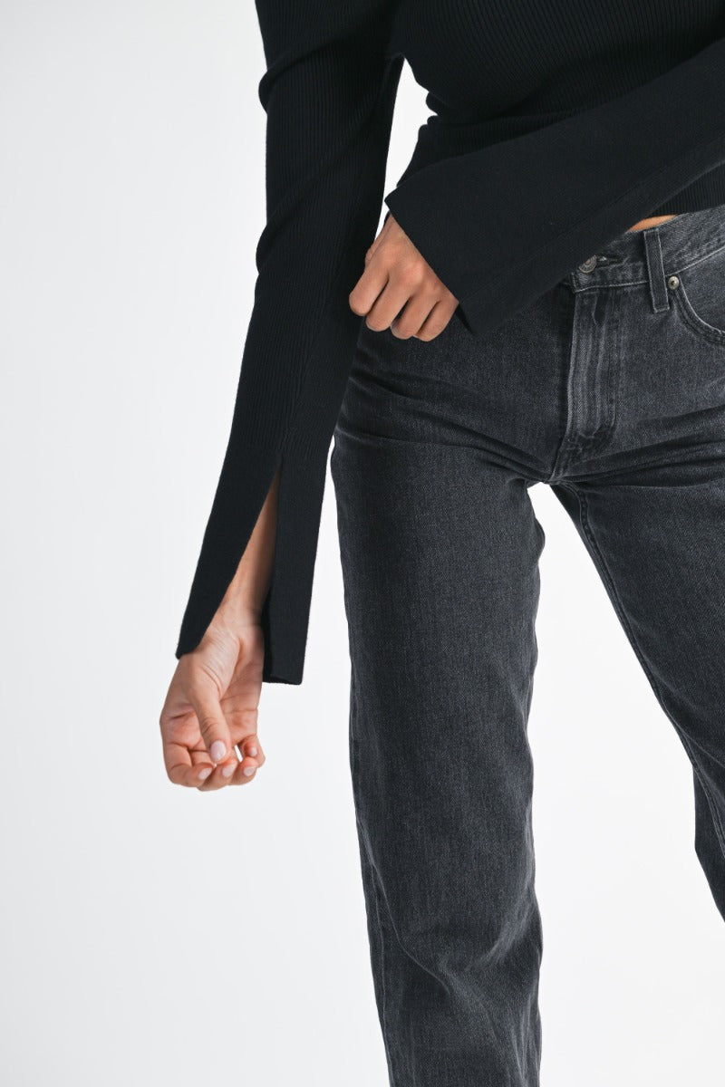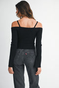Solid ribbed spaghetti strap long sleeve with flare slit cuff detail off shoulder knit sweater.