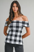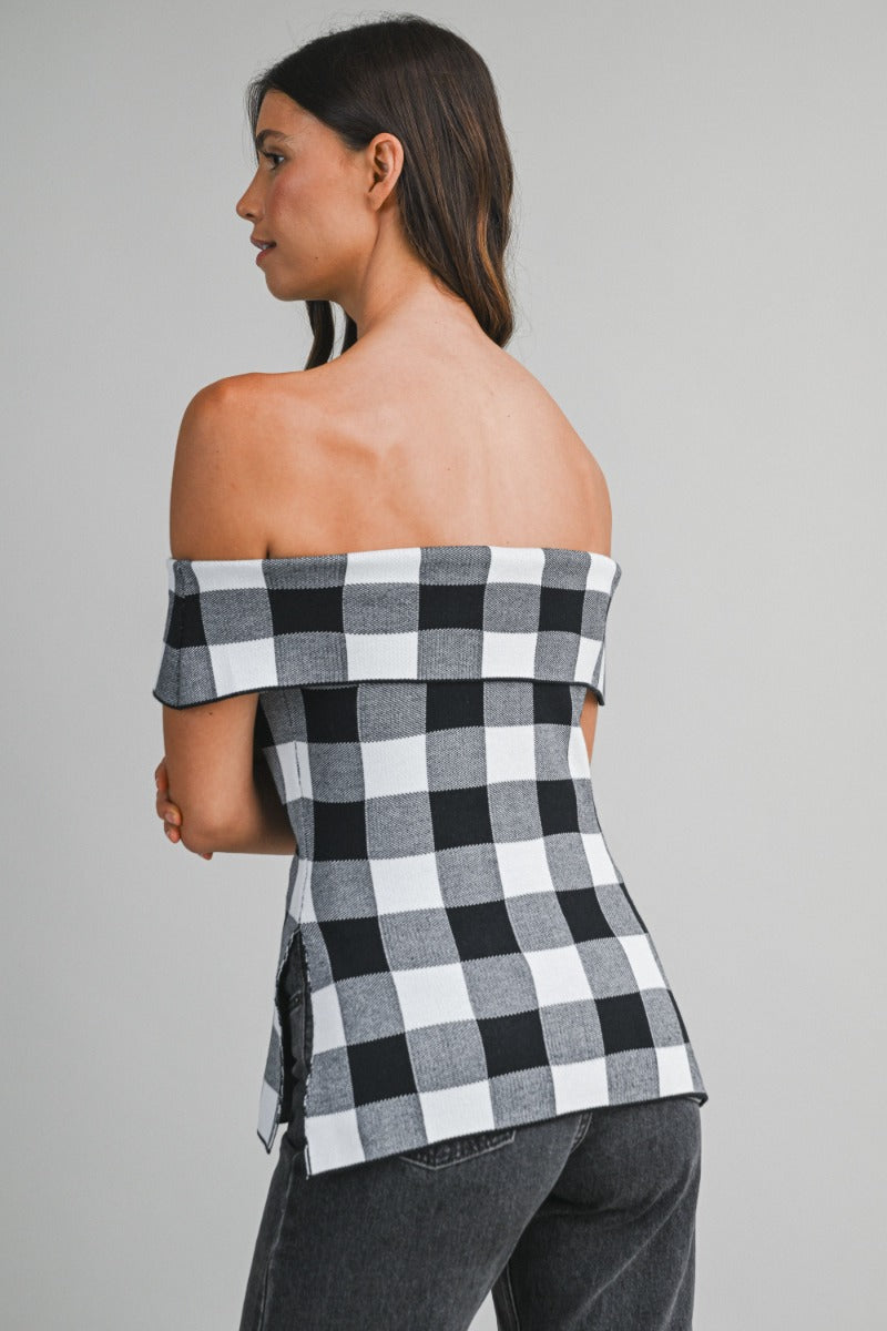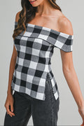 New for Spring! Gingham off-shoulder knit top featuring a folded neckline and side slit detail. Designed for a fitted silhouette with a stretch knit texture.