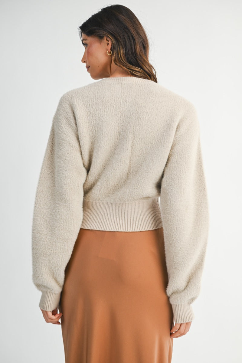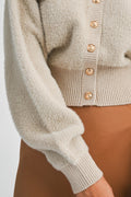 Solid fuzzy knit long sleeve round neck gold button down cardigan.
