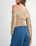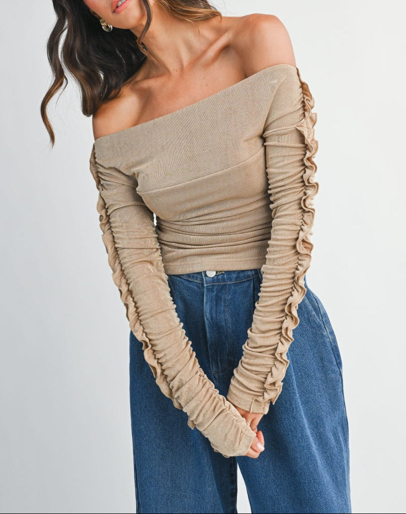 Off-the-shoulder solid slinky knit fabric ruched long sleeve with ruffle-edge sleeve detail top.